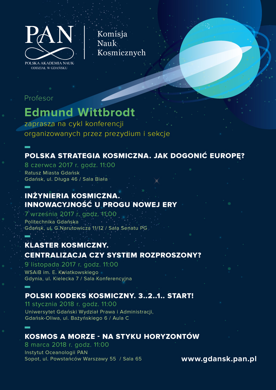 Była to kolejna z cyklu konferencji naukowych zaplanowanych i organizowanych przez Komisję Nauk Kosmicznych przy Oddziale PAN w Gdańsku, pod przewodnictwem prof. dr hab. Edmunda Wittbrodta. Celem tych Konferencji jest wymiana informacji i doświadczeń a także tworzenie płaszczyzny porozumienia oraz integracji środowisk ze świata nauki, administracji i gospodarki, działających w dziedzinie wykorzystania przestrzeni kosmicznej. Morze i Kosmos - to dwa obszary, których poznanie i eksploatowanie wciąż stawia nowe wyzwania. Rozwój technologii umożliwia coraz szersze korzystanie z zasobów morskich i coraz śmielsze sięganie w tym celu do technik kosmicznych. Zamierzeniem Konferencji „KOSMOS A MORZE – NA STYKU HORYZONTÓW” jest stworzenie platformy do wymiany poglądów, przedstawienia wiedzy i przedyskutowania wyników badań i zastosowań wiążących te dwa obszary pozornie tylko od siebie odległe. Łączy je szereg zagadnień związanych z regulacjami prawnymi, zarządzaniem i technologiami omawianymi na poprzednich spotkaniach z tego cyklu. Ich morskie aspekty a w szczególności bezpieczeństwo na morzu, łączność satelitarna, nawigacja i teledetekcja będą głównymi tematami tych kolejnych obrad.