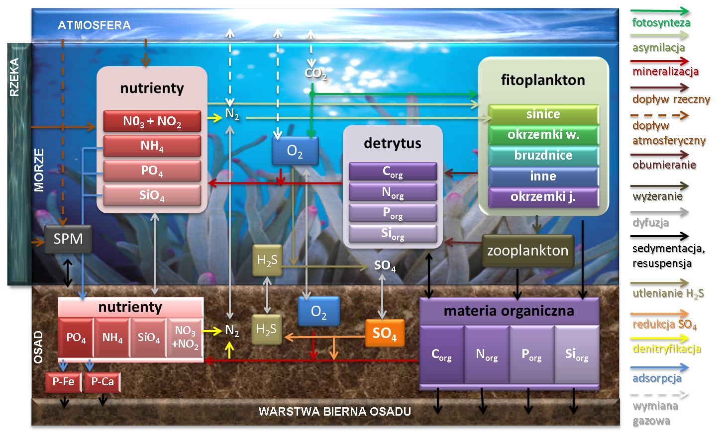 Źródłem tlenu w wodzie morskiej jest proces fotosyntezy, a także natlenianie w wyniku wymiany gazowej z atmosferą. W trakcie destrukcji materii organicznej tlen jest zużywany. Proces ten może prowadzić do deficytu tlenu. W przypadku braku tlenu rozpuszczonego zużywany jest tlen zawarty w siarczanach w wyniku czego powstaje siarkowodór. Schemat konceptualny części ekologicznej modelu przedstawiono na rysunku. Model uwzględnia 18 zmiennych stanu obejmujących w toni wodnej: 5 grup fitoplanktonu, zooplankton, substancje biogeniczne, węgiel oraz formy organiczne azotu, fosforu i krzemu w detrytusie, tlen rozpuszczony i siarkowodór.