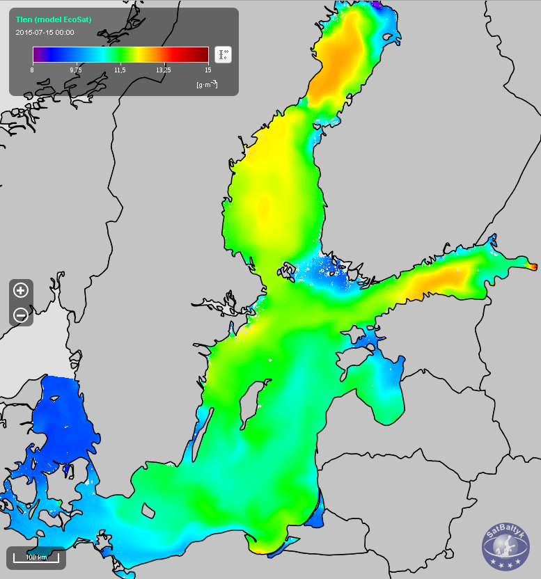 Stężenie tlenu rozpuszczonego w wodzie obliczone za pomocą modelu ekohydrodynamicznego EcoSat. Mapy stężeń tlenu o rozdzielczości 1 km otrzymywane są poprzez interpelację przestrzenną wyników modelu EcoSat, którego rozdzielczość przestrzenna wynosi od ok. 5,5 km. Obliczenia za pomocą modelu są wykonywane na 18 warstwach o zmiennej grubości, co pozwala obliczyć rozkłady pionowych stężeń tlenu na różnych głębokościach. W serwisie System SatBałtyk rozkłady stężeń tlenu na powierzchni oraz na różnych głębokościach podawane są w gramach tlenu na metr sześcienny [g m-3], cztery razy na dobę.
