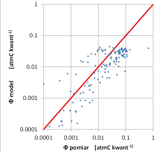 Walidację wydajności kwantowej fotosyntezy fitoplanktonu przeprowadzono na wybranych głębokościach w warstwie eufotycznej w badanych akwenach Bałtyku. Pomiary 118 kompletów parametrów niezbędnych do wyznaczenia wydajności kwantowej przeprowadzono w okresie 2006-2011 podczas rejsów na statkach Oceania i Baltica. Standardowy czynnik błędu x (patrz tabela poniżej) charakteryzujący metodę wyznaczania wydajności kwantowej fotosyntezy Φ za pomocą algorytmu DESAMBEM jest stosunkowo mały i wynosi 1,439 a to oznacza, że logarytmiczny błąd statystyczny wynosi od σ- = -30,5% do σ+ =43,9%.
